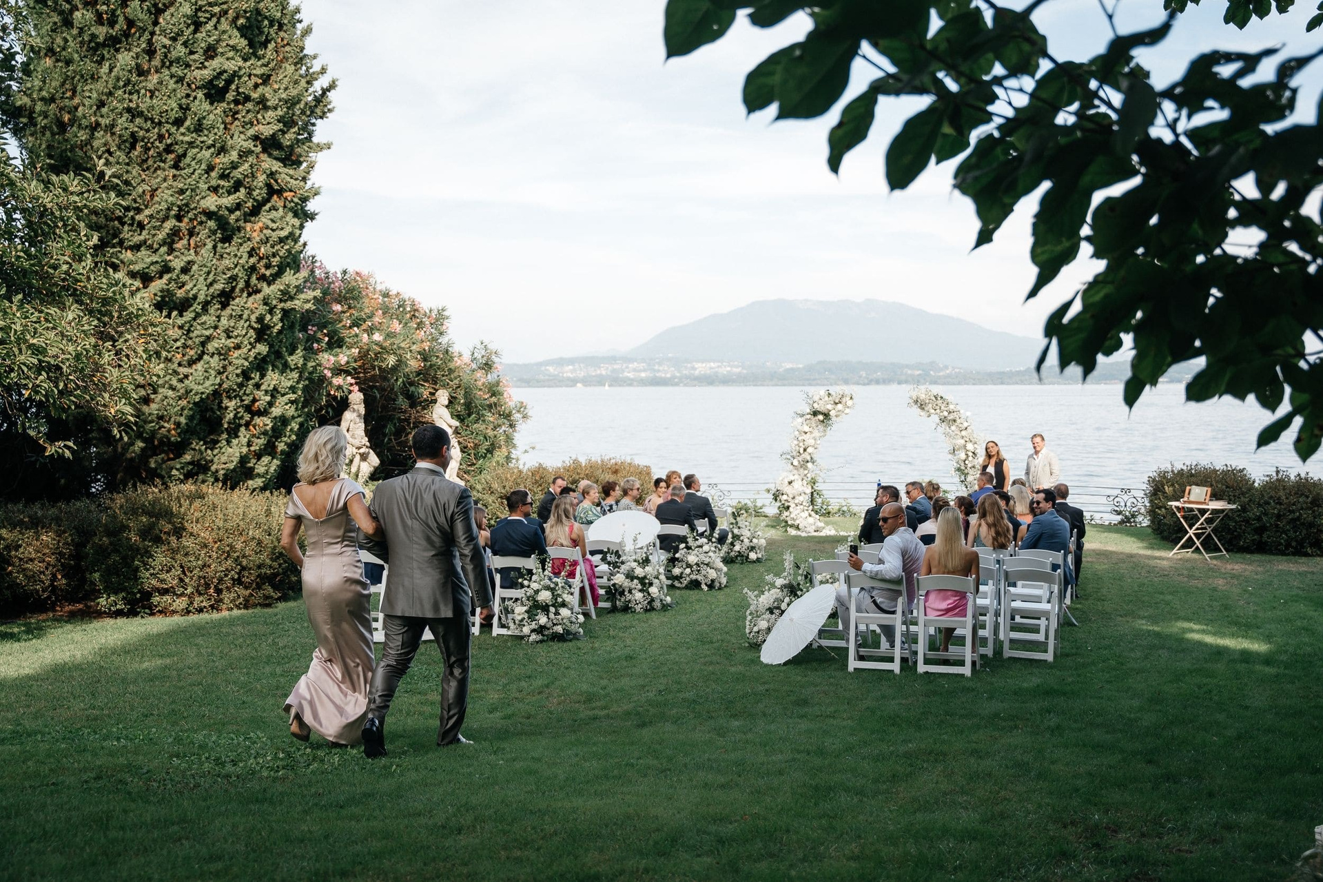 The free ceremony took place right in front of the villa, with Lake Maggiore as the backdrop. The couple exchanged emotional vows, creating a moment that felt intimate and honest. Guests were close, the setting was quiet, and every word carried meaning.
