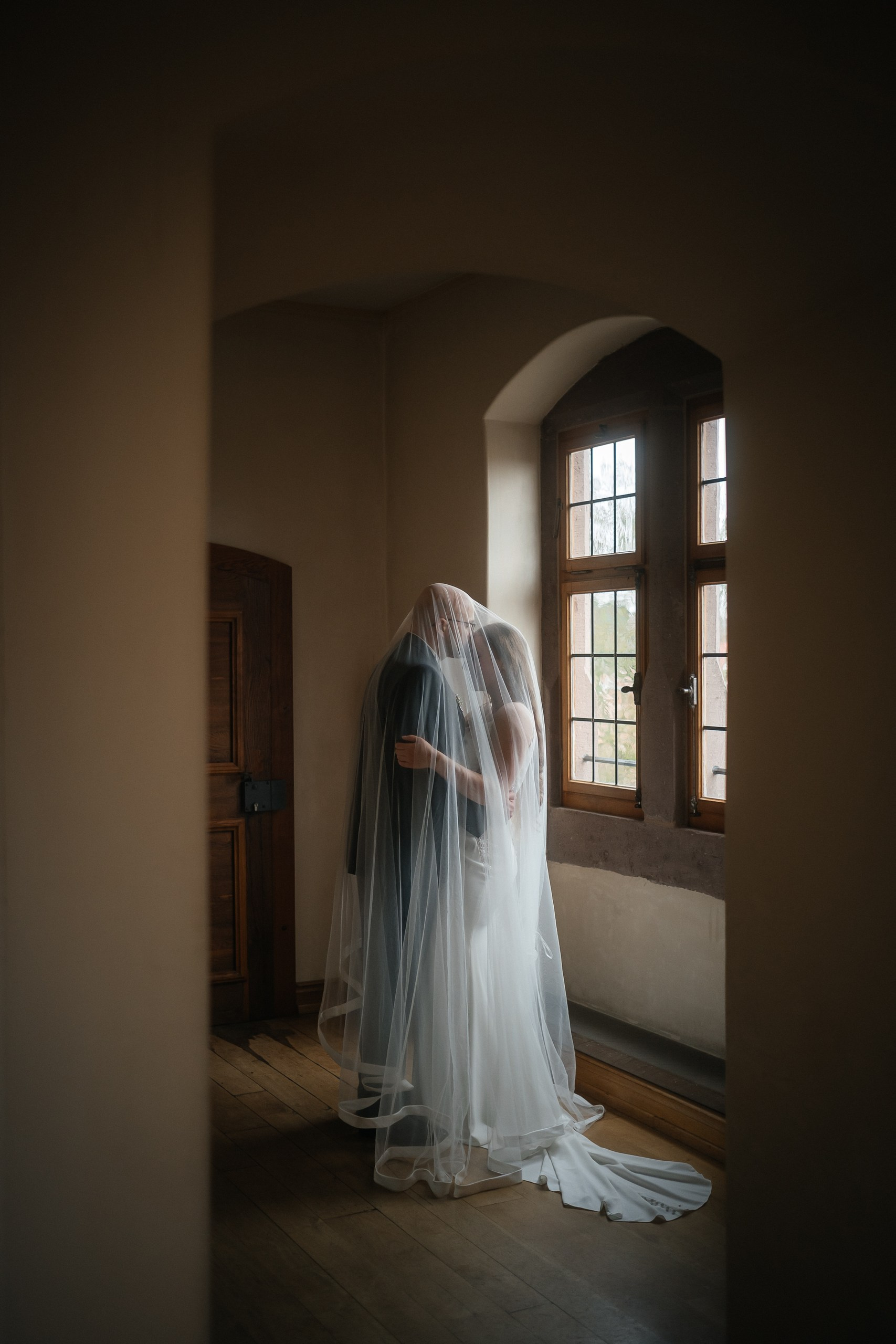 The bride often gets ready in one of the castle towers. The rooms offer privacy and a quiet space to prepare. An emotional first look with the father can also take place there before he walks his daughter to the ceremony.